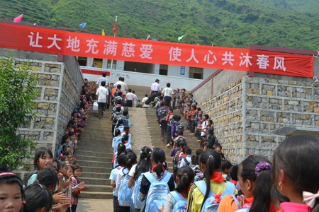 捐贈儀式上,牛艷平部長代表中國人口福利基金會向達布小學的師生表示親切的慰問。牛艷平部長說:“鎮寧縣地處黔之腹,顛之喉,我們初到就感受到了這里人民的樸實熱情、風光秀美。今天,為支持少數民族貧困地區教育,霽霽愛心基金為貴州省鎮寧縣、黔西南州晴隆縣共計11所小學共捐贈1500套課桌椅、1500套書包文具和1500套玩具公仔。希望同學們能在全社會的關愛中好好學習。”