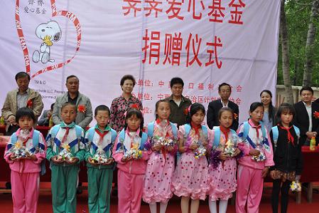 此次寧夏之行,霽霽愛心基金為固原市隆德縣、彭陽縣、中衛市海原縣的13所鄉鎮小學的2000名學生捐贈物資。為了幫助改善貧困山區的學習條件,霽霽愛心基金捐贈了孩子們在學習上急需的課桌椅和書包;除此之外,還捐贈了公仔玩偶,對大多數山里的孩子們來說,這是他們的第一個玩具,每個人看到Snoopy公仔時都愛不釋手;考慮到山區夏天蚊蟲較多,此次捐贈還特意為孩子們送去驅蚊、止癢膏,讓他們免受蚊蟲叮咬的困擾。