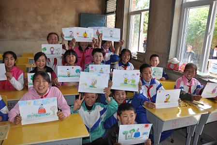 隨后,大家走訪了杜川小學、溫堡小學、楊堡小學的5個班級,親自幫孩子們換上新桌椅,發放新書包,送去了公仔玩偶和驅蚊產品。陳穎女士還為兩個班級的學生上了英語課和美術課。陳穎教同學們讀Snoopy的名字,還講述了花生漫畫中最著名的格言:幸福,是一只溫暖的小狗。孩子們領到了畫紙和畫筆,發揮自己的想象,為花生漫畫中的人物涂上五彩的顏色,最終都完成了屬于自己的花生漫畫。
