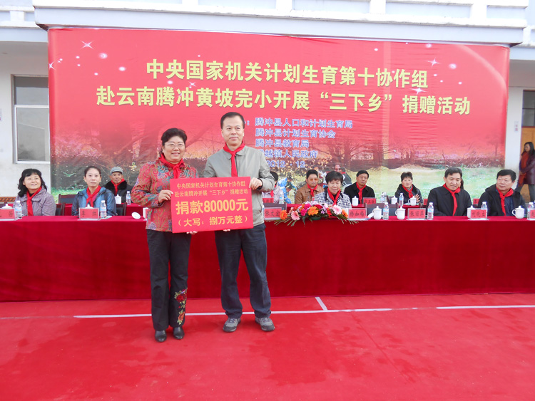 捐贈(zèng)儀式上,騰沖縣人大常委會(huì)副主任、計(jì)生協(xié)會(huì)長(zhǎng)楊如梅在致辭中對(duì)中央國(guó)家機(jī)關(guān)計(jì)劃生育第十協(xié)作組表示感謝的同時(shí),希望老師們熱愛(ài)學(xué)校、關(guān)愛(ài)孩子,促進(jìn)每一個(gè)學(xué)生的健康、和諧、全面的發(fā)展;要求學(xué)校要?jiǎng)?lì)精圖治、嚴(yán)謹(jǐn)辦校,把黃坡完小辦成一所領(lǐng)導(dǎo)滿(mǎn)意、社會(huì)滿(mǎn)意、家長(zhǎng)放心、學(xué)生成才的學(xué)校。中央國(guó)家機(jī)關(guān)計(jì)劃生育第十協(xié)作組組長(zhǎng)、國(guó)務(wù)院國(guó)資委機(jī)關(guān)服務(wù)管理局張文宏局長(zhǎng)作了重要講話(huà),希望學(xué)校能夠始終堅(jiān)持以學(xué)生健康成長(zhǎng)、發(fā)展成才為本的辦學(xué)理念,堅(jiān)持“嚴(yán)與慈誨人不倦,讀與寫(xiě)學(xué)而不厭”的宗旨,努力將學(xué)生培養(yǎng)成為“有理想、有創(chuàng)新、講文明、具特色”的有用之人,營(yíng)造“文明、勤奮、求實(shí)、創(chuàng)新”的良好校風(fēng)。在捐贈(zèng)交接儀式完成之后,黃坡完小校長(zhǎng)代表全校師生向中央國(guó)家機(jī)關(guān)計(jì)劃生育第十協(xié)作組以及長(zhǎng)期關(guān)心、支持和幫助學(xué)校發(fā)展的各級(jí)領(lǐng)導(dǎo)的表示由衷的感謝。學(xué)校師生還通過(guò)表演文藝節(jié)目來(lái)表達(dá)誠(chéng)摯的感激之情。之后,參觀了學(xué)校圖書(shū)室,并與學(xué)校師生們進(jìn)行了親切交談,走訪(fǎng)慰問(wèn)了4戶(hù)當(dāng)?shù)赜?jì)生家庭。