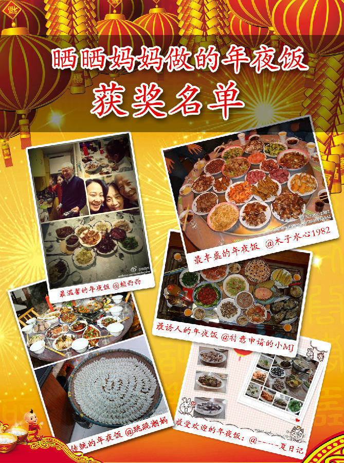 最溫馨的年夜飯:@賴西西 最誘人的年夜飯:@特意申請的小MJ 最豐盛的年夜飯:@木子水心1982 最傳統的年夜飯:@跳跳潮媽 最受歡迎的年夜飯:@----夏日記