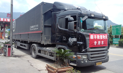 滿載救災(zāi)物資的順豐貨車抵達(dá)雅安多營,等待進入蘆山災(zāi)區(qū)的通行證