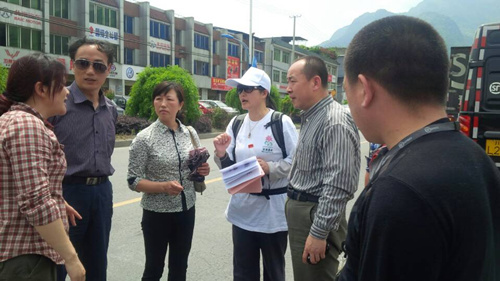 社會聯(lián)絡(luò)部部長宋宏云(右二)、慈愛基金志愿者(右三)與蘆山縣計生局干部在多營協(xié)調(diào)處理災(zāi)區(qū)通行許可事宜