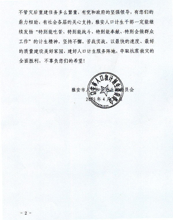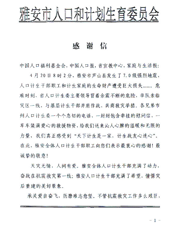 近日,中國人口福利基金會收到雅安市人口計生委的感謝信。信件內容如下: