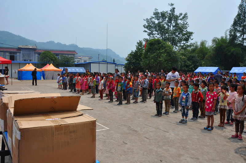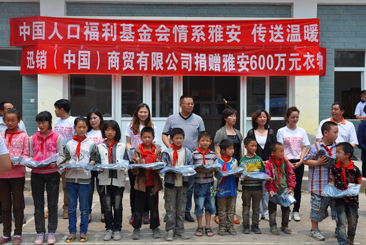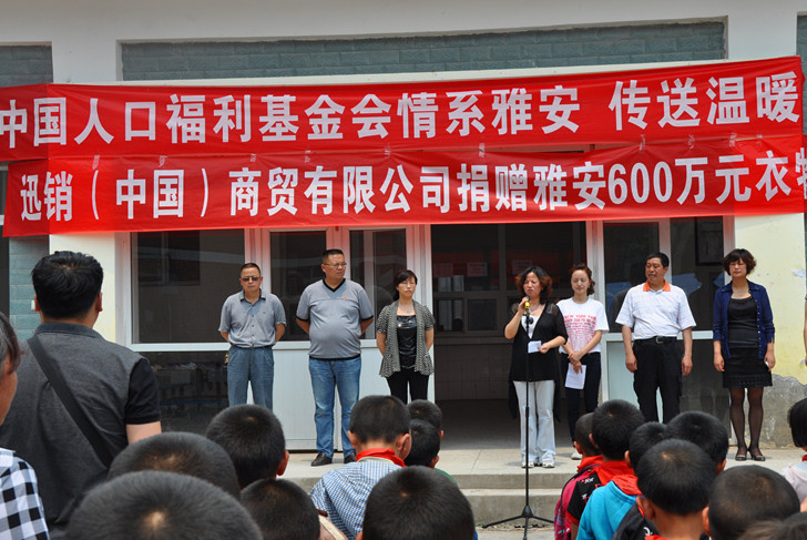 5月23日上午,捐贈活動在雅安市天全縣新華一小舉行,中國人口福利基金會國際合作部部長李曉琳出席并發表講話,參加捐贈的領導還有雅安市人口計生委黨總支書記陶智瓊、天全縣政協主席楊茂雄等,捐贈企業上海迅銷(中國)商貿有限公司市場部主管董春芳等代表也到現場,新華一小350余名師生參加了捐贈活動。