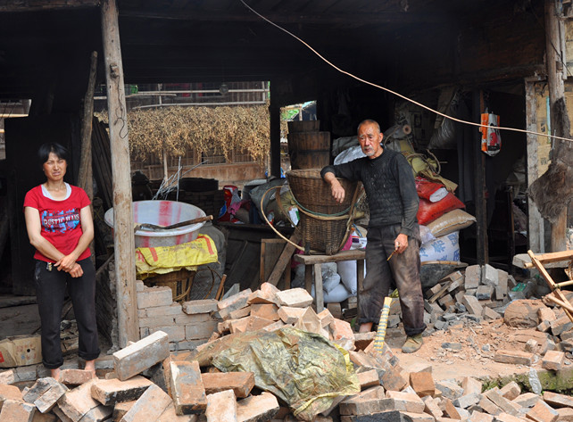 天全縣受災家庭在自家破損的房子里