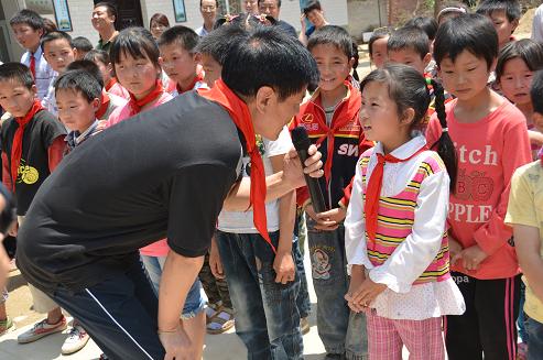 教室里的孩子在與嘉賓一起做游戲,還有好多同學趴在窗戶外面新奇地看著