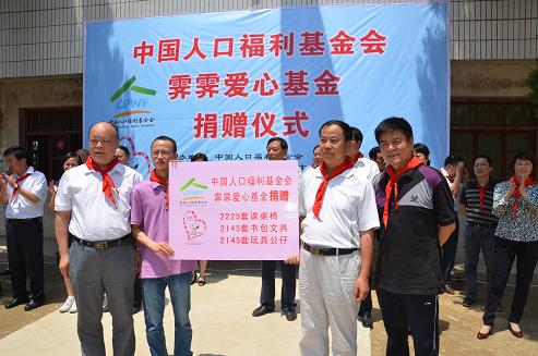 捐贈活動于2013年6月4日在洋縣磨子橋鎮金土完全小學舉行,中國人口福利基金會副秘書長葛振江,霽霽貿易有限公司深圳辦事處經理助理馬錫森,陜西省人口計生委副主任、計生協副會長陳昭等領導、嘉賓出席。