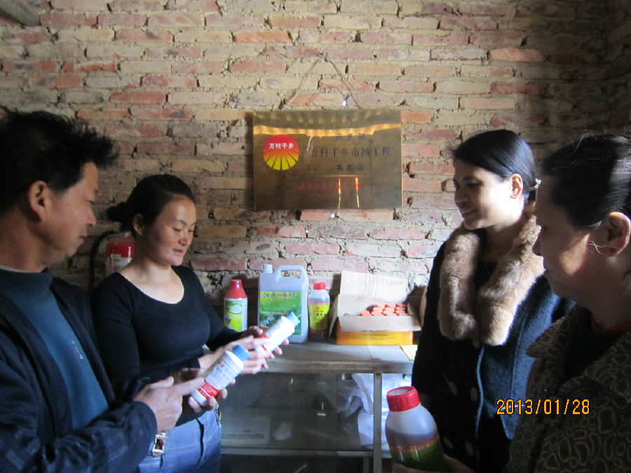 圖為黃巧云(左二)把農藥免息賒給育齡姐妹,并耐心地指導農藥使用方法