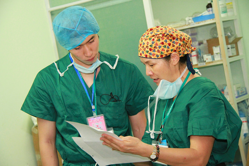 “幸福微笑”國際醫療隊護士長李松蓮向醫療隊志愿者Michael交待患兒手術名單