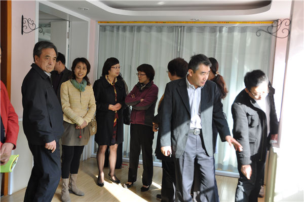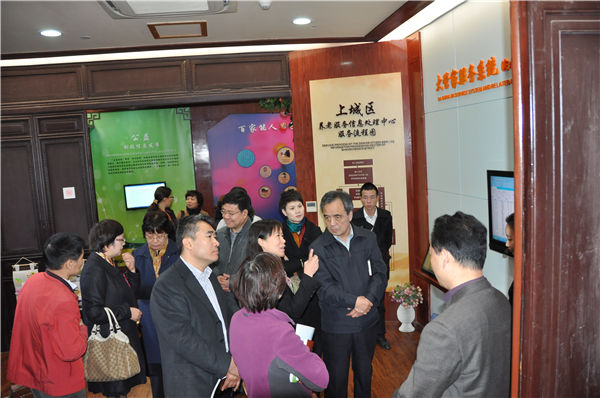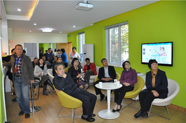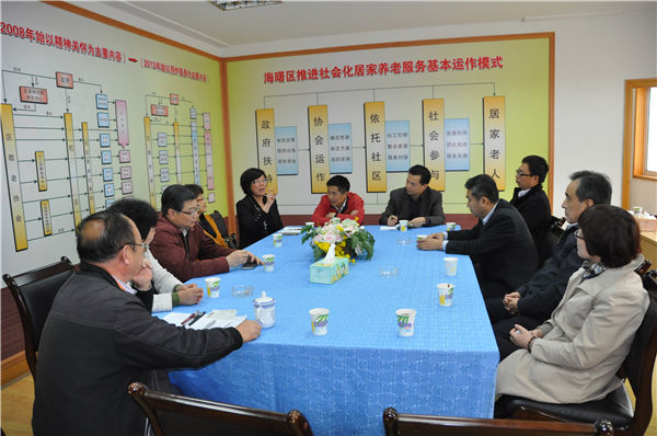 在寧波市海曙區并肩行照護院,區政府領導向調研組宣傳當地推進社會化居家養老服務的做法和經驗