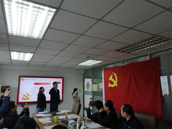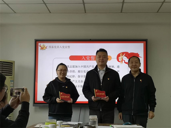 入黨宣誓儀式在莊嚴的《國際歌》聲中開始,張迪、付強兩名新黨員在組織委員祝美琳同志的帶領下,面向鮮紅的黨旗,鄭重舉起右拳進行莊嚴宣誓。副書記宋宏云同志為兩位新黨員佩戴黨徽并頒授“黨員示范崗”標牌。兩位同志先后發言。張迪表示,在黨組織和黨員同志們的幫助下,終于由一名普通員工成長為一名光榮的共產黨員,還要繼續在黨組織的培養下,堅定理想信念,牢記黨的宗旨,為黨的事業奮斗終身。付強表示,面對鮮紅的黨旗鄭重宣誓,感到無尚光榮,衷心感謝黨組織的教育和培養,在今后的日子里,將不斷學習,切實發揮一名黨員的先鋒模范作用,用自己的實際行動全心全意為人民服務。