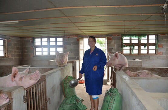 幸福母親楊谷奇在自家豬圈給豬喂食