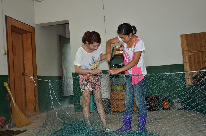 徐尾女在向記者展示她每天編織漁網(wǎng)的工作