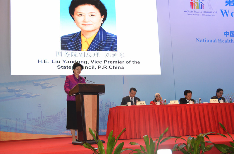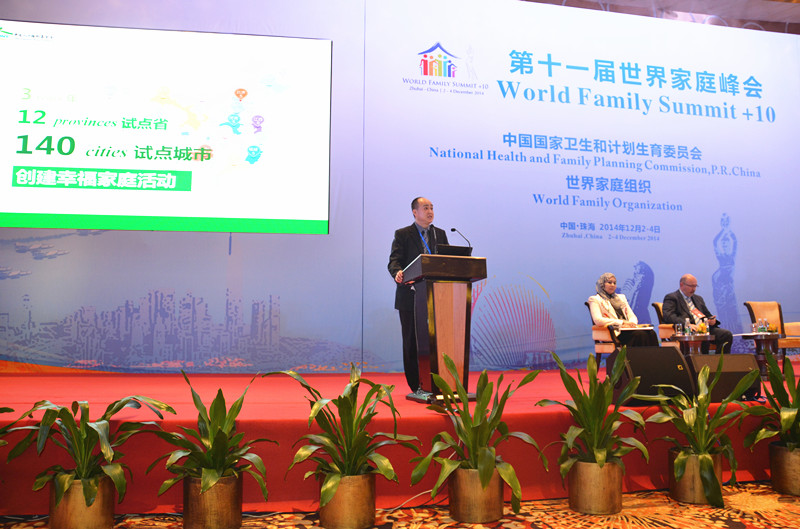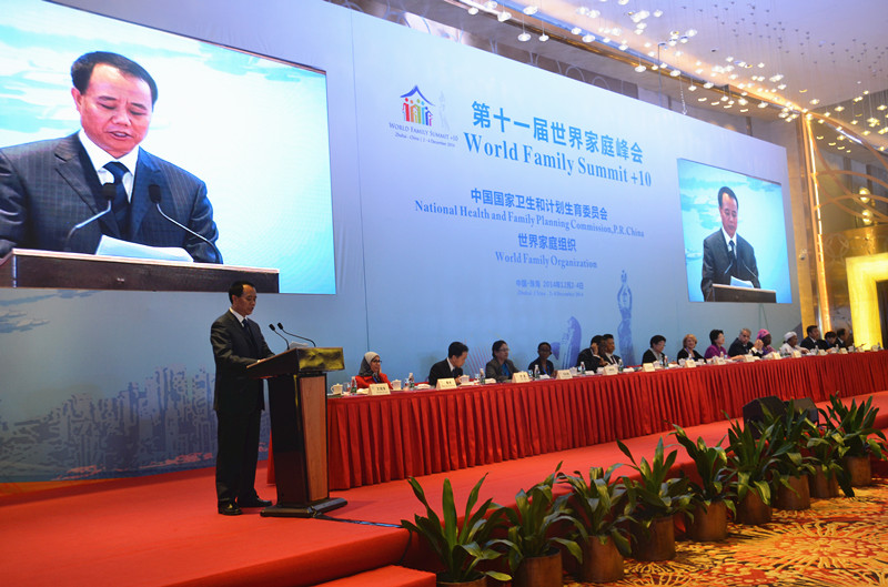 2日上午,峰會舉行開幕式,國家衛生計生委李斌主任代表劉延東副總理會見外賓并作主旨演講,聯合國副秘書長巴巴圖德先生、世界家庭組織主席黛西女士、廣東省政府領導等發表致辭。會上,世界家庭組織為中國關工委主任、中國人口福利基金會榮譽會長顧秀蓮及中國人口福利基金會會長王忠禹頒發“特別貢獻獎”。隨后進行的峰會部長圓桌會上,國家衛生計生委李斌主任發表講話,介紹了中國政府近年圍繞推動家庭經濟發展、維護家庭成員健康、健全家庭功能及促進家庭和諧幸福等方面做出的探索和實踐,并提出中國政府面對2015年后家庭發展議程的行動和希望。