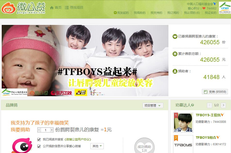2014年,中國人口福利基金會通過微公益平臺籌款近80萬元,共有超6萬名網友參與捐款,人基會先后獲得“新浪微博最具影響力公益組織”稱號和微公益三周年“最杰出貢獻獎”。感恩每位捐贈和支持公益事業的網友,我會將更加嚴謹的執行項目,保證公開、公正、透明,和我們益起來用微博之力,讓世界更美!
