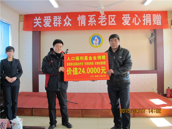 葛振江副秘書長代表人基會向阜平縣捐贈了價值24萬元藍氧治療儀一臺,衛生包3000份及2112件價值187680元的服裝。