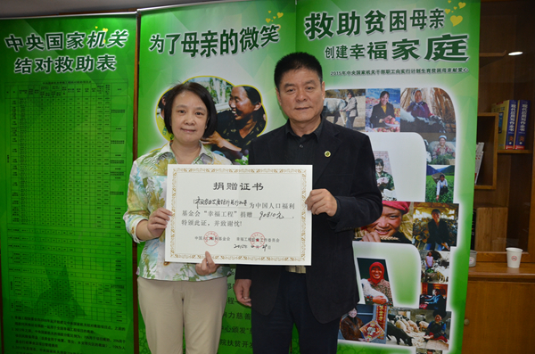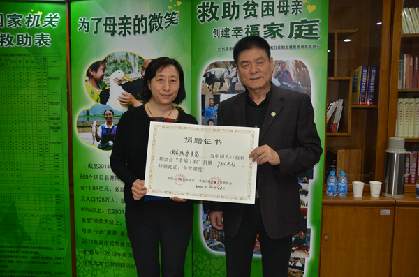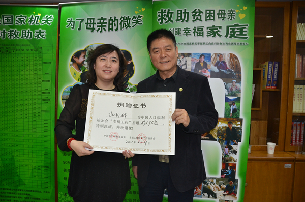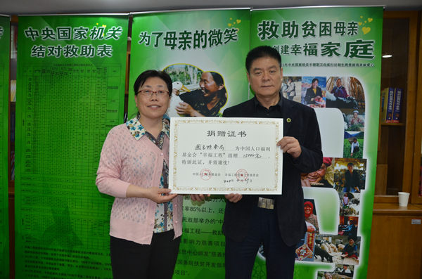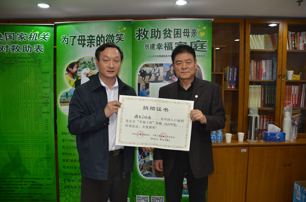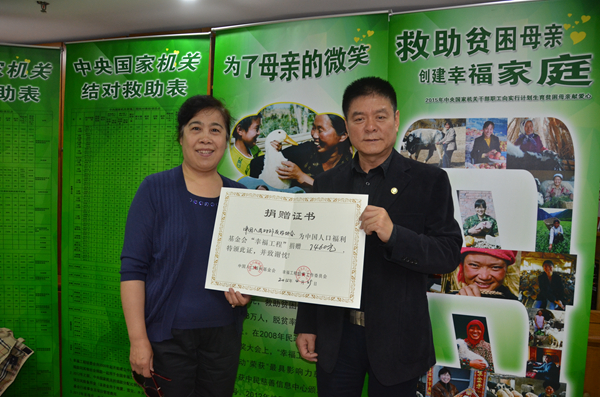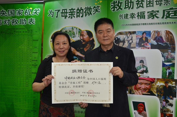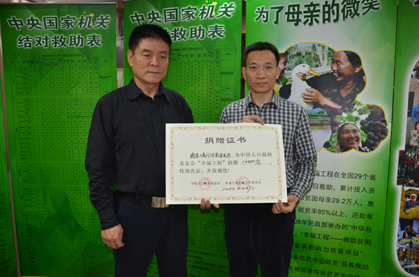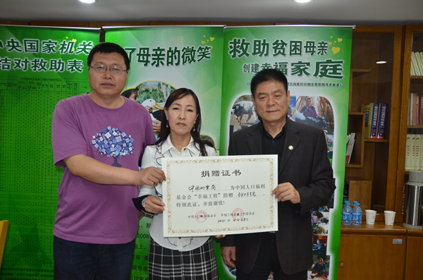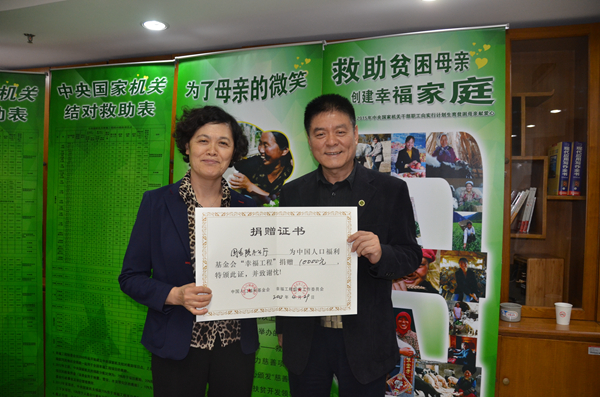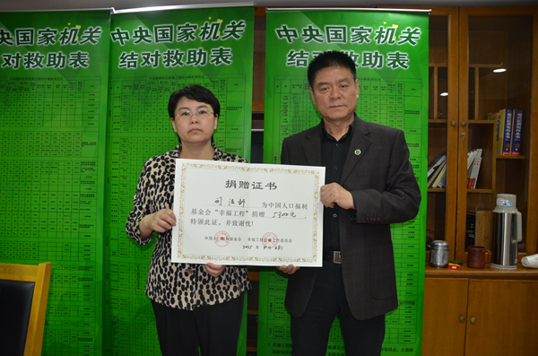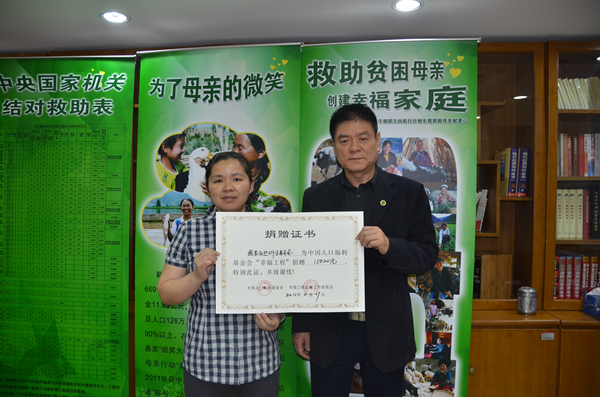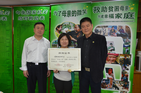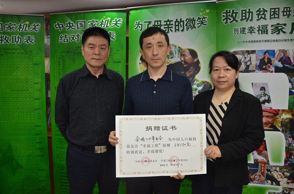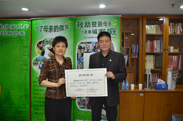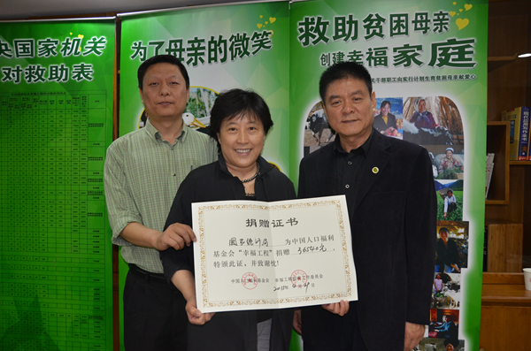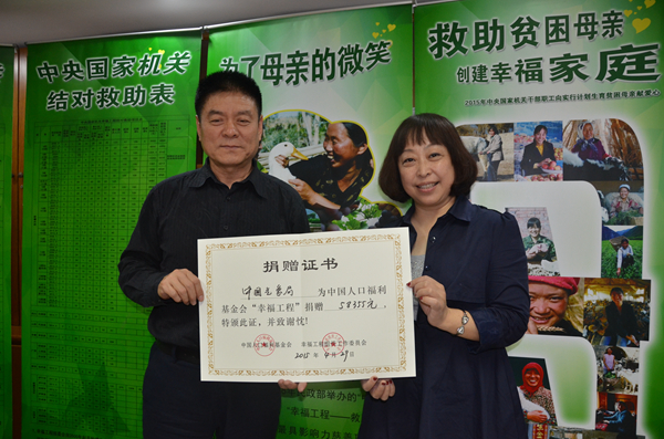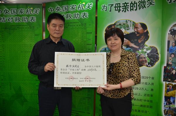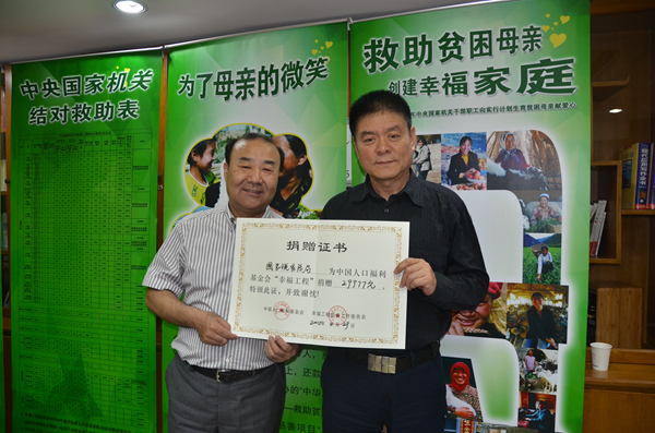 幫助困境母親,建設幸福家庭今年4月28—29日,中央國家機關計生辦組織開展了“向實行計劃生育的貧困母親獻愛心”捐款活動。截至5月,中央國家機關88個部門共捐款5496990.42元。