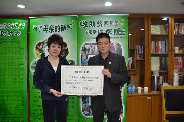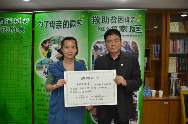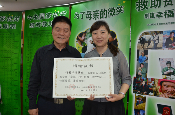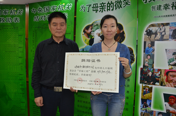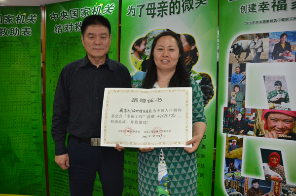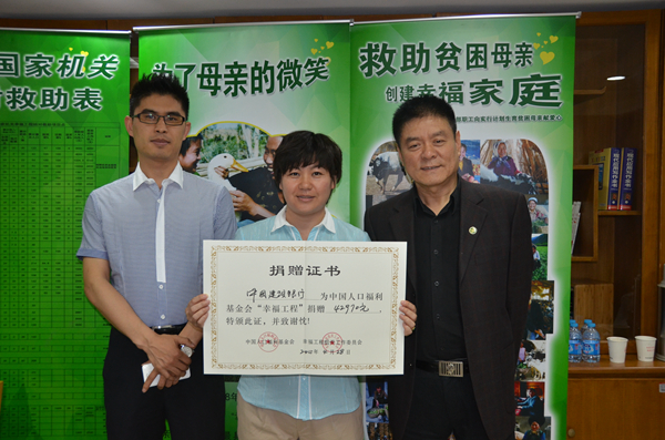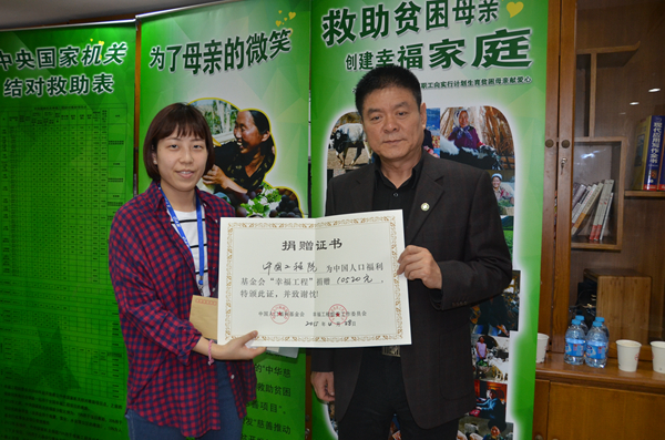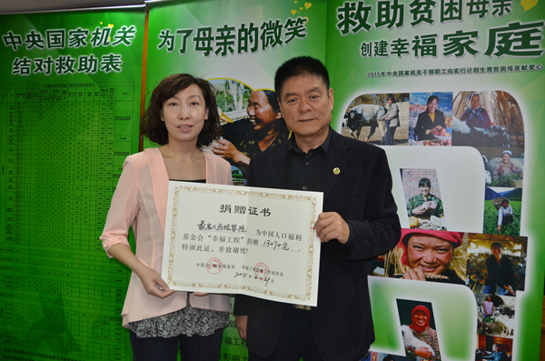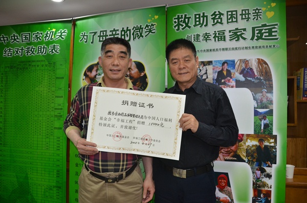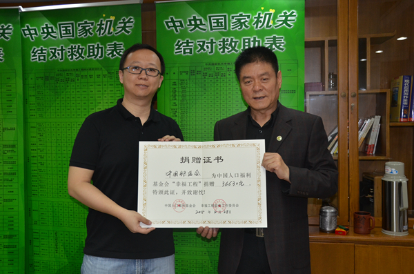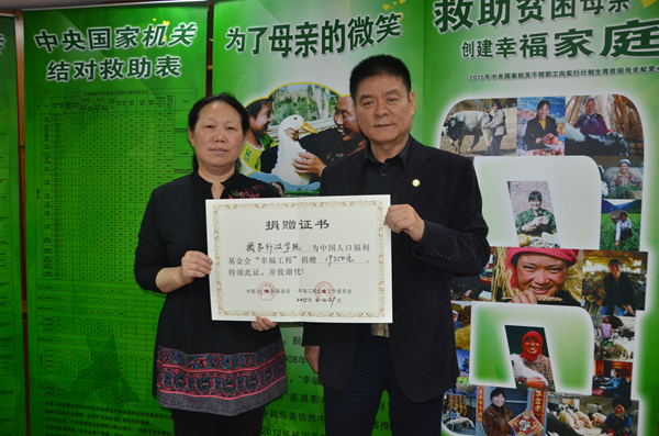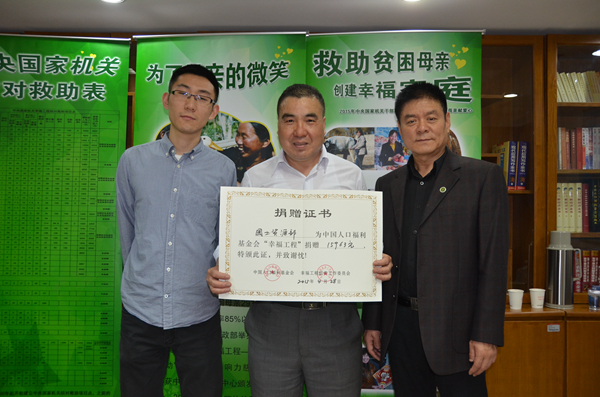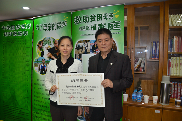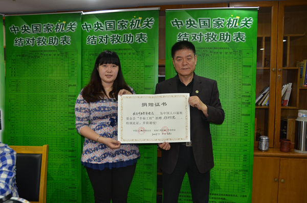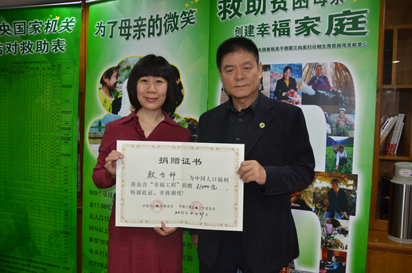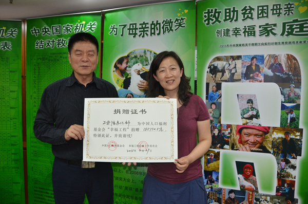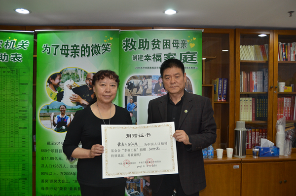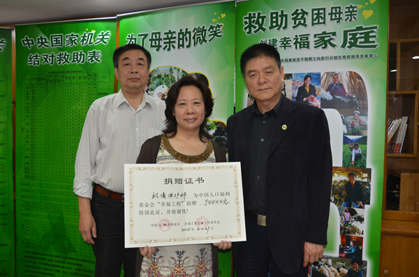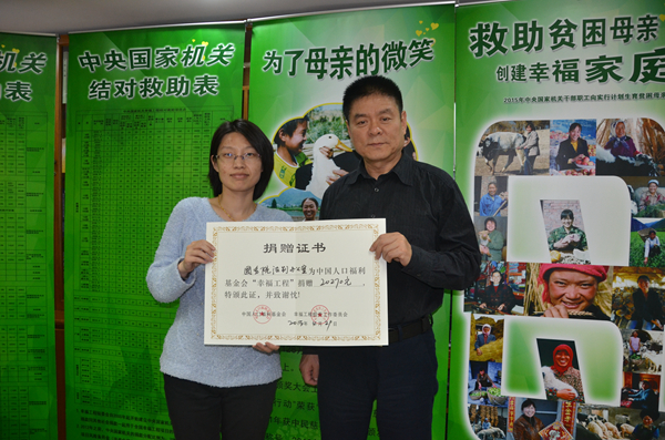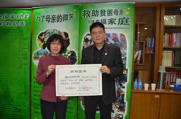 幫助困境母親,建設幸福家庭今年4月28—29日,中央國家機關計生辦組織開展了“向實行計劃生育的貧困母親獻愛心”捐款活動。截至5月,中央國家機關88個部門共捐款5496990.42元。