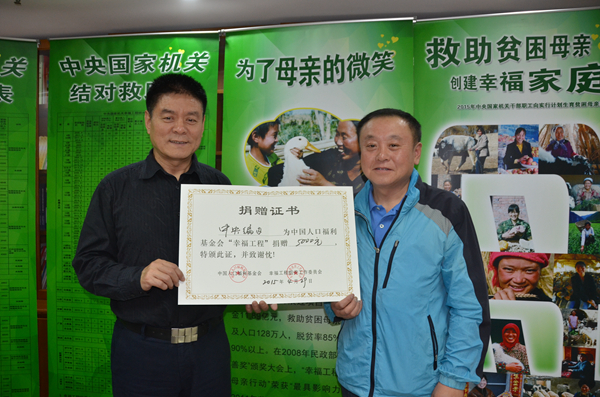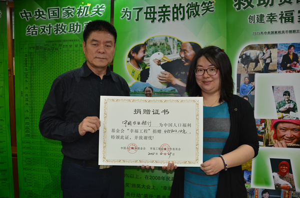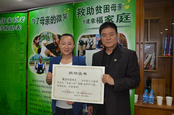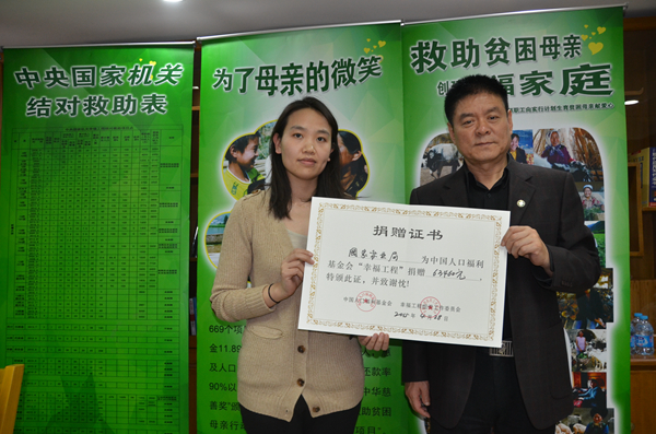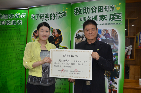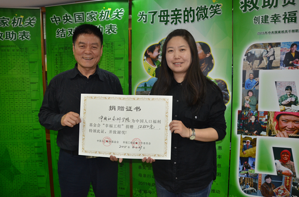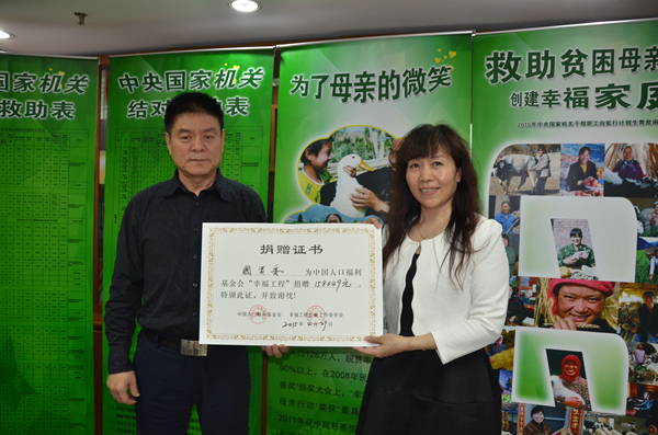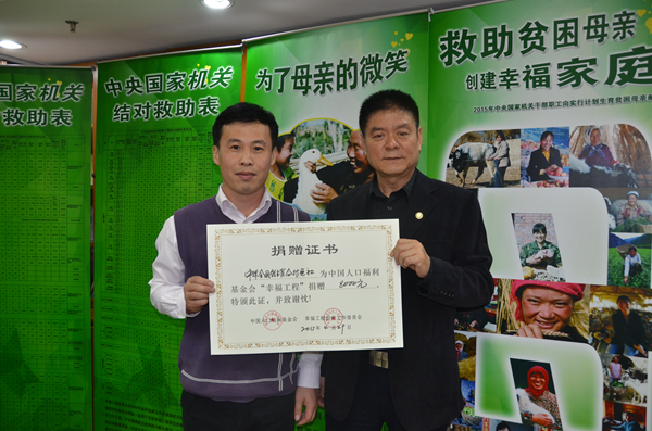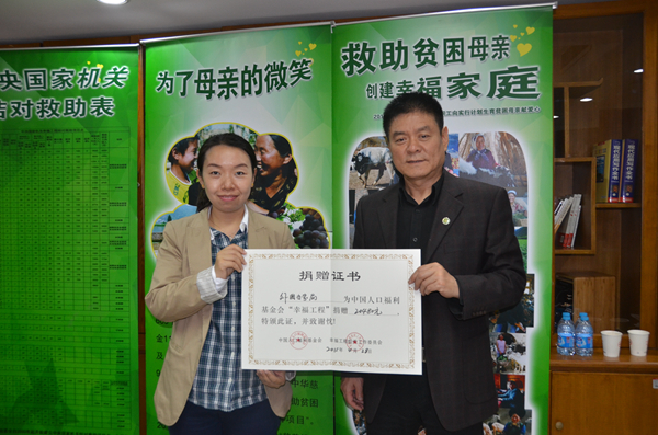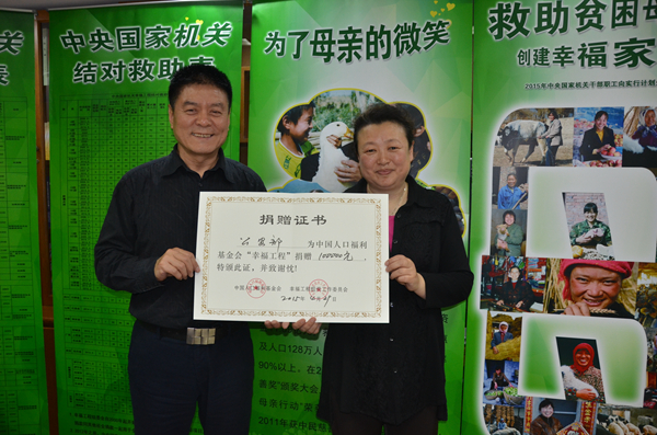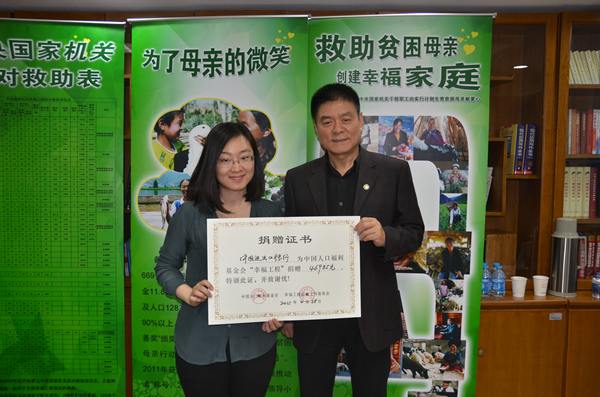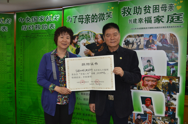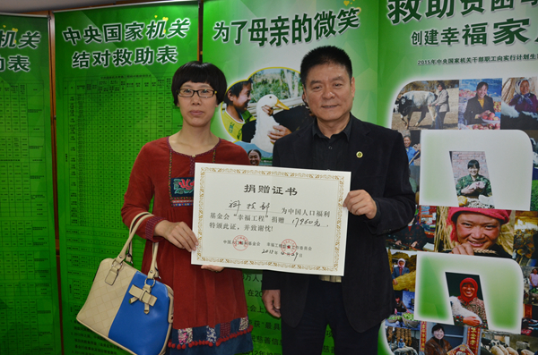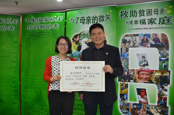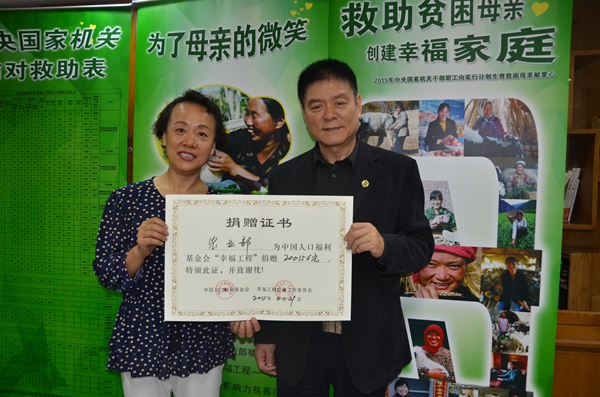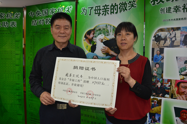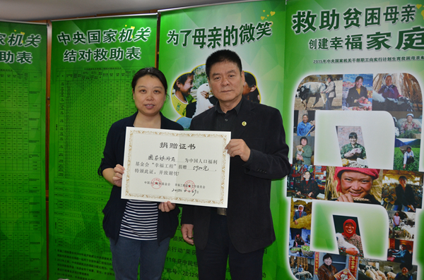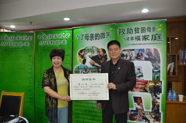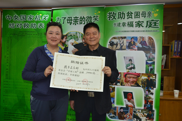 幫助困境母親,建設幸福家庭今年4月28—29日,中央國家機關計生辦組織開展了“向實行計劃生育的貧困母親獻愛心”捐款活動。截至5月,中央國家機關88個部門共捐款5496990.42元。