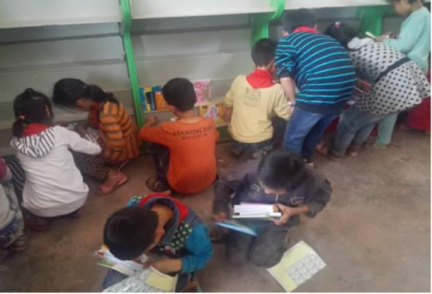 四川瀘州古藺縣信合小學——同學們在幫忙整理圖書,并給圖書貼標簽上架