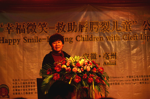 在啟動儀式上,中國人口福利基金會副秘書長俞華、亳州市市委副書記杜延安及美國微笑聯盟副會長黃球綸分別致辭,安徽省計生委、安徽省人口基金會、安徽省計生協、亳州市委、亳州市人民政府、亳州市計生委、亳州市計生協相關人員出席了啟動儀式。