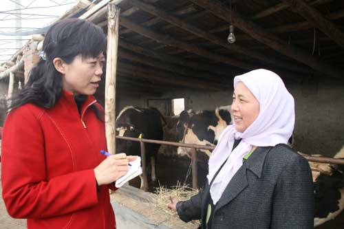 3月25日,新疆生產(chǎn)建設(shè)兵團(tuán)農(nóng)十師一八四團(tuán)計生協(xié)工作人員正在向8連幸福工程受助母親王桂蘭了解奶牛養(yǎng)殖情況。該團(tuán)計生協(xié)對全團(tuán)20戶貧困母親從生產(chǎn)、生活、生育上進(jìn)行救助,幫助她們治愚、治病、治窮。通過幾年來的幫扶,20戶貧困母親已全部脫貧。