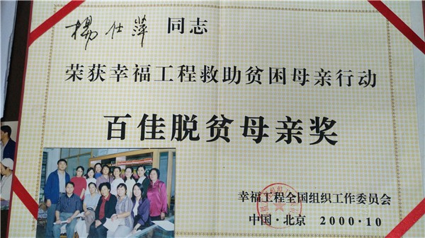 2000年楊仕萍母親獲得的幸福工程“百佳脫貧母親獎(jiǎng)”獎(jiǎng)狀