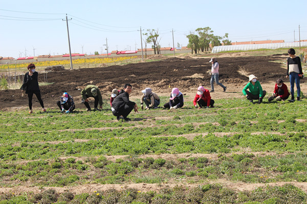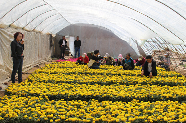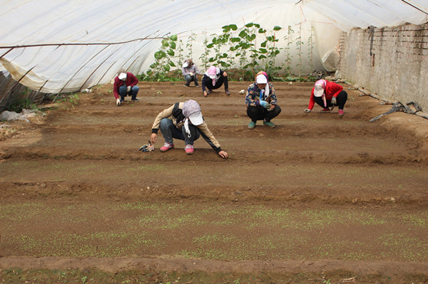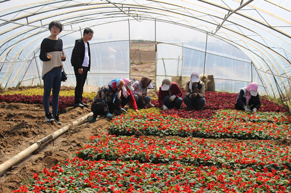 母親們在花卉大棚給花卉間苗